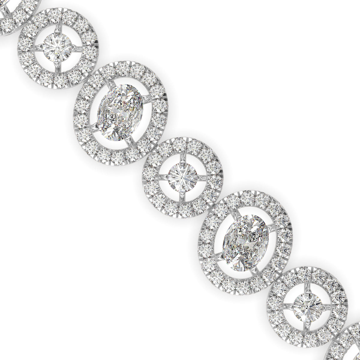 Oval brilliance and round halos connect in a flowing pattern, wrapping the wrist in harmonious, sparkling symmetry.